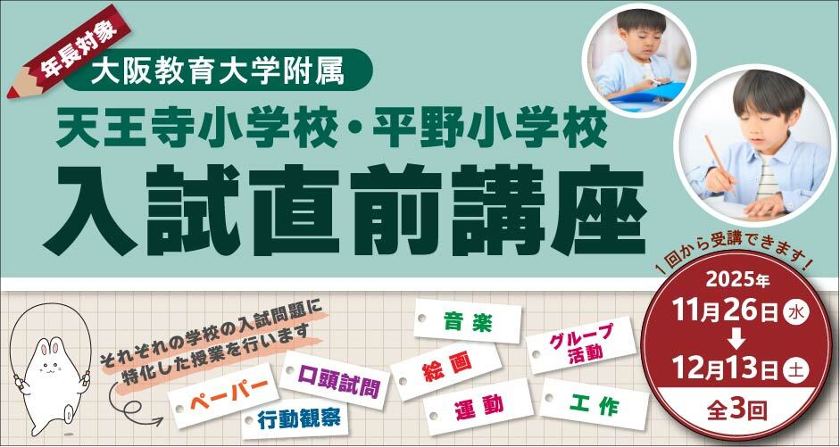 | 大阪教育大学附属 天王寺小学校 | 15人 合格率54% | 14人 合格率50% | 20人 合格率51% | 16人 |
